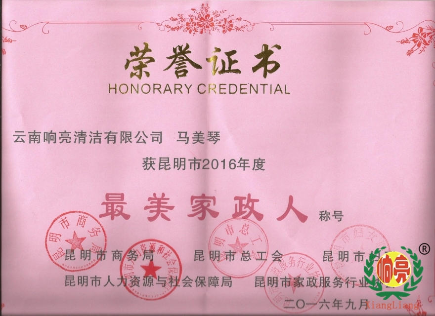 云南響亮清潔有限公司-總經(jīng)理-馬美琴-被昆明市評選為昆明市-最美家政人-榮譽稱號